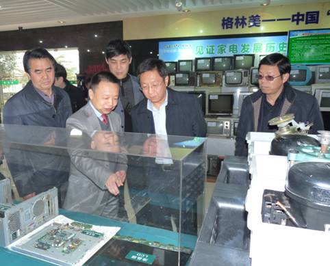 图1. 省科技厅副厅长杜耘(右二)在荆门格林美总经理周继锋陪同下参观格林美循环展厅