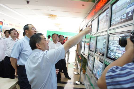 图1. 董事许开华教授向武汉市委阮成发书记(二排左一)和武汉市常务副市长贾耀斌(二排右一)一行介绍格林美视频监控系统