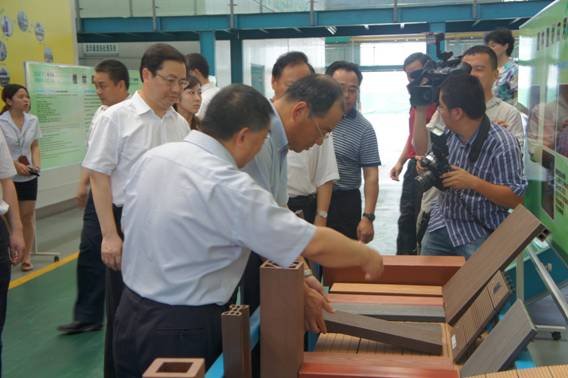 图4. 阮书记高度赞赏格林美用废塑料生产的塑木型材,表示要在全市推广