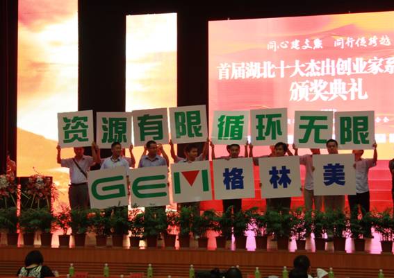 ????? 2012年8月30日,首届湖北十大杰出创业家颁奖典礼在东湖国际会议中心隆重召开,逾50多家企业、政府、企业界近1000多人和全省的优秀企业家齐聚一堂,共同庆祝此次民营企业盛会。武汉格林美资源循环有限公司荣膺 “湖北民营经济最具社会责任感企业”光荣称号,武汉格林美资源循环有限公司总经理王健代表公司参加颁奖典礼并领取了“湖北民营经济最具社会责任感企业”奖项。