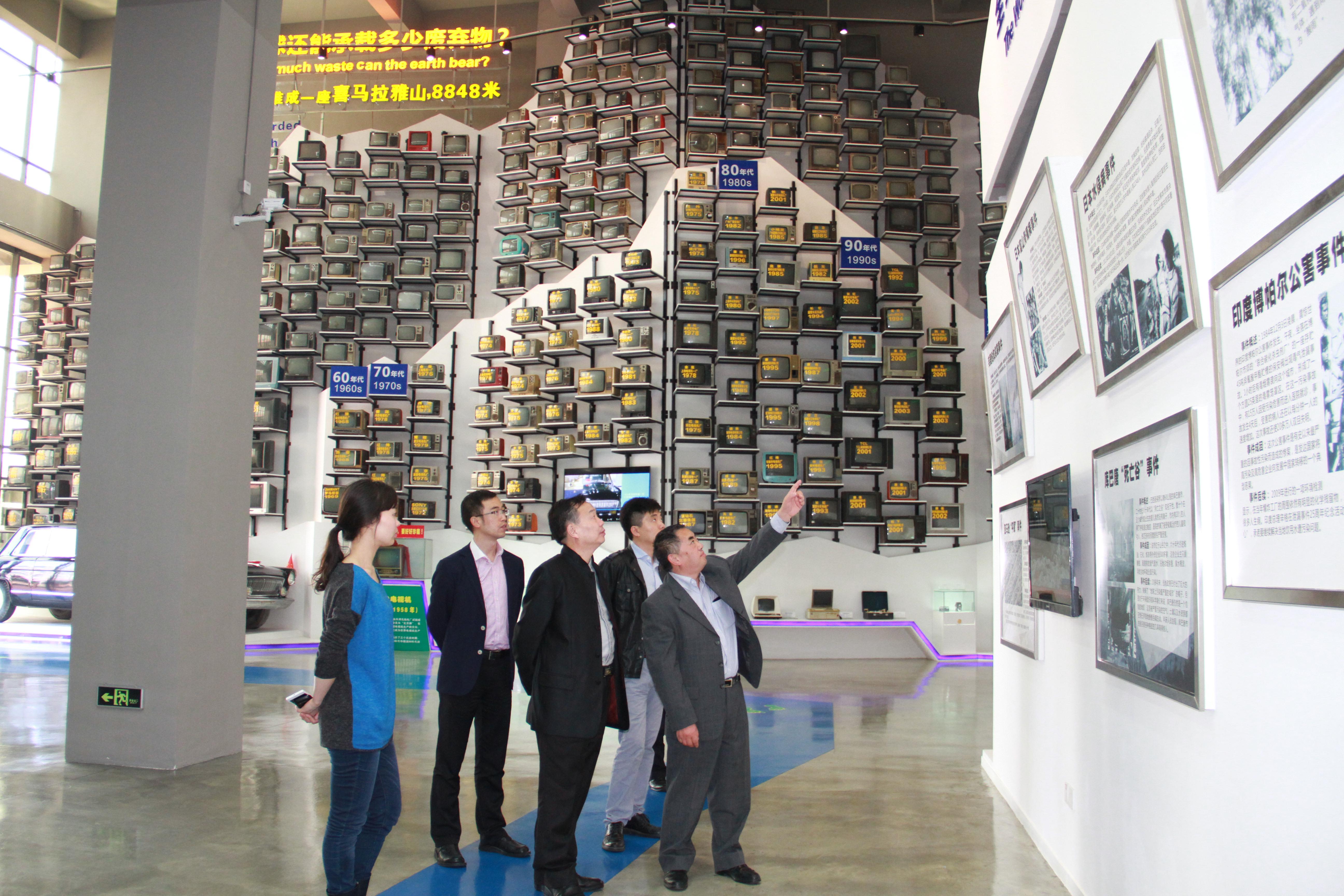 图一 许开华董事长(右一)陪同潘永斌董事长(左三)参观格林美国家循环经济教育示范基地“城市矿山”博物馆