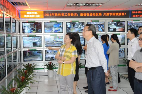 图2 周健男副主任(左二)通过公司的物联网系统查看公司各产业园的运行情况