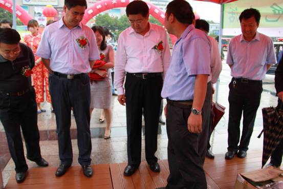 图三 孙刚副省长(中),邓兴明厅长(左二)饶有兴致的查看塑木型材木地板