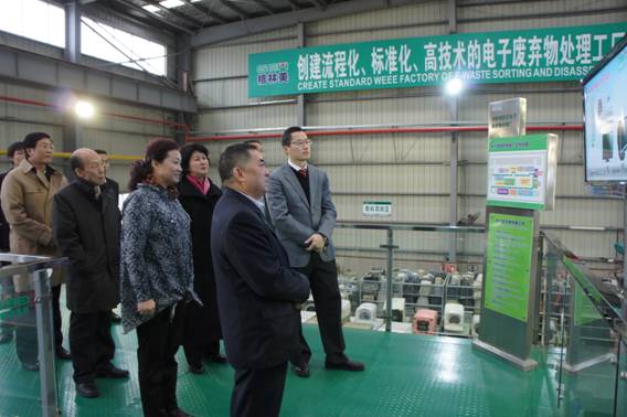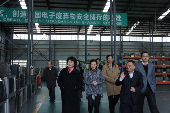 图2 刘艳荣巡视员(左一)、沈竹林处长(右一)在省发改委荆奇副巡视员(后左一)、高技术处董宏斌处长(左三)、尚晓丽副处长(后左二)和董事长许开华教授、王敏常务副总陪同下参观格林美电子废弃物仓库