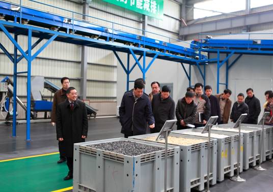 图二 岳市长一行对格林美电子废弃物拆解分选得到的废塑料表示了浓厚的兴趣,高度赞赏格林美“变废为宝”
