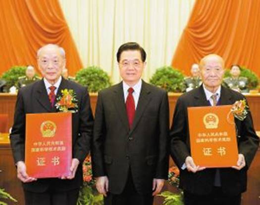 图一 胡锦涛总书记向中国科学院院士、中国工程院院士师昌绪(右)和中国工程院院士、