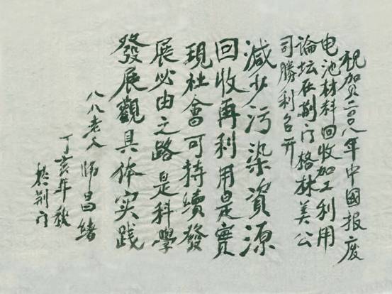 师院士曾于2008年10月15日至17日在荆门举行的报废电池材料回收加工利用论坛期间考察格林美荆门产业园,在公司董事长许开华教授陪同下参观了格林美循环实验室、电池解剖车间、生产车间及分析检测中心,对格林美在废旧电池材料的回收加工利用方面所取得的成绩给予了充分肯定。并专门为格林美题词:“祝贺二00八年中国报废电池材料回收利用论坛在荆门格林美公司胜利召开!减少污染,资源回收再利用是实现社会可持续发展必由之路,是科学发展观具体实践 ”, 在师老荣获国家最高科学技术奖励之际,重温师老的亲笔题词,更加深切感受到师老对格林美公司循环产业发展的充分肯定,必将极大鼓舞全体格林美人再接再厉,继续在循环产业的自主创新、跨越发展的道路上创造新的辉煌!