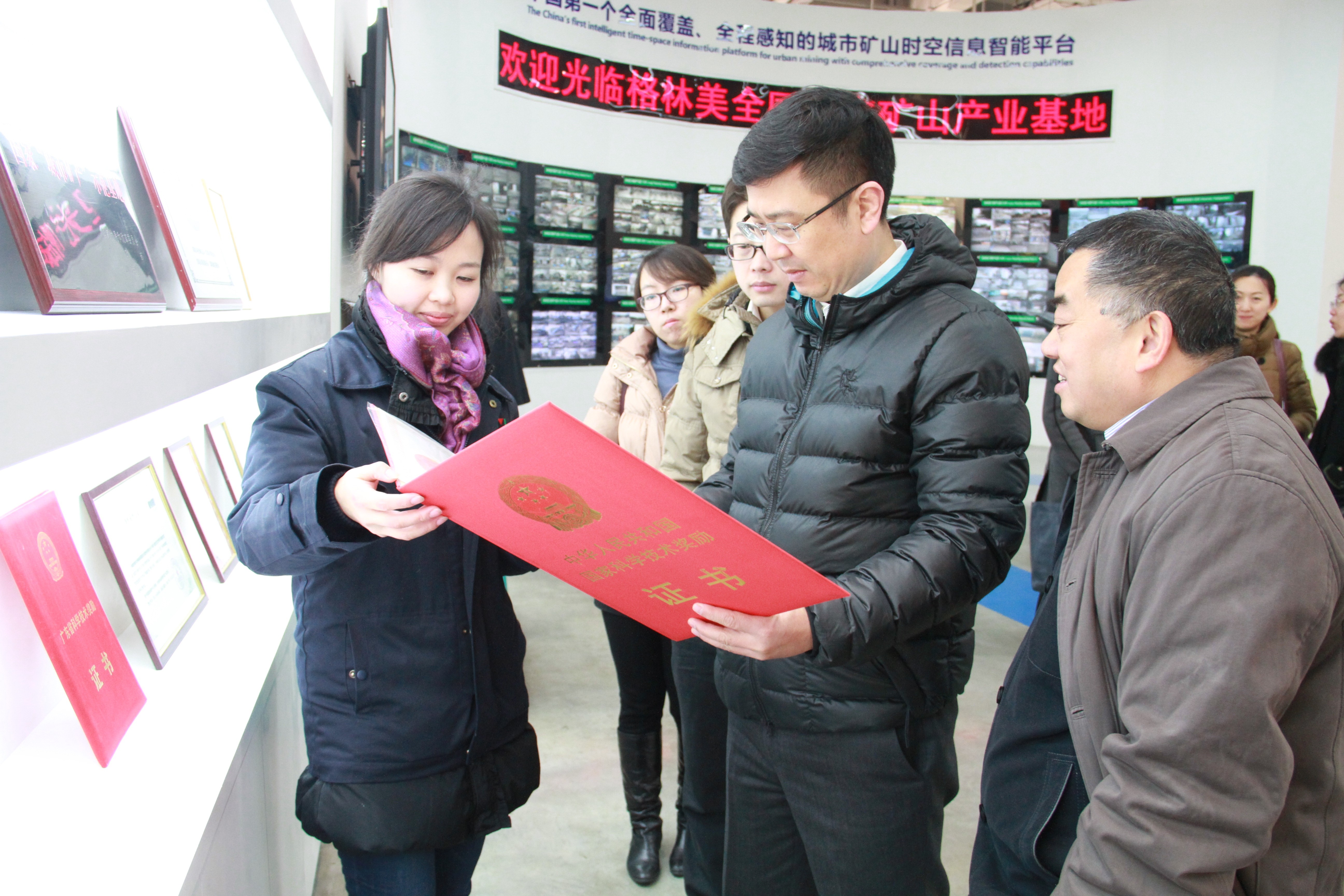 图二 中节能安总一行观看格林美荣获的“国家科技进步奖”等奖项
