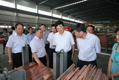 郭生练副省长(前左二)在荆门市委副书记、市长万勇(右一)、湖北省科技厅副厅长彭泉(二排左一)陪同下莅临荆门格林美城市矿产资源循环产业园视察工作。