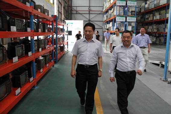 图2. 国家发改委体改司孔泾源司长(前左一)一行在董事长许开华教授陪同下参观格林美电子废弃物仓库