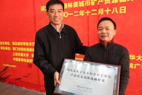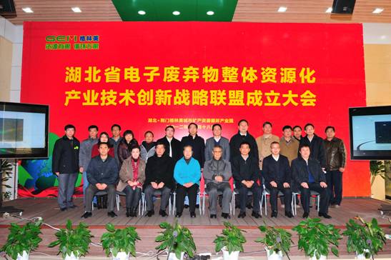 ??? 2012年12月18日上午,湖北省电子废弃物整体资源化产业技术创新战略联盟成立大会在荆门格林美城市矿产资源循环产业园隆重举行(以下简称“联盟”),联盟是在湖北省委、湖北省政府和湖北省科技厅的大力支持和积极推动下,由荆门市格林美新材料有限公司、北京工业大学、中南大学、清华大学、清华大学深圳研究生院、上海交通大学、华中科技大学、中国科学院广州能源研究所及中国家用电器研究院、深圳市格林美高新技术股份有限公司、荆门市绿源废渣废泥环保处置有限公司、天津浩博华瑞资源再生装备技术有限公司荆门分公司等十二个单位共同发起成立的。湖北省科技厅方国强副厅长、吴月朗处长,荆门市张丑合副市长、专家代表左铁镛院士、许振明教授、熊惟皓教授、张一敏教授等近50人参加了成立大会。