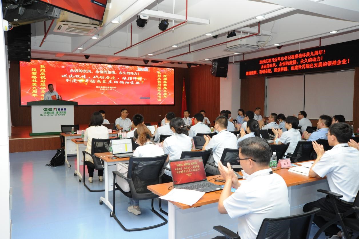 为激励全体格林美人不忘循环初心,牢记绿色使命,以“抢”、“敢”、“拼”的奋斗精神践行习近平总书记“把垃圾资源化、化腐朽为神奇”的殷切嘱托,策马扬鞭,燃烧激情,奋战十四五,突破800亿,创建世界绿色发展的领袖企业,2022年7月22日晚上19:00,格林美集团在深圳总部与16个园区隆重举行习近平总书记视察格林美九周年的庆典活动。集团党委书记、董事长许开华教授,集团董监高、集团各分子公司负责人、核心管理人员、研究院全体人员、总部全体人员、全体党员、入党积极分子以及2022届新入职大学生等参会。