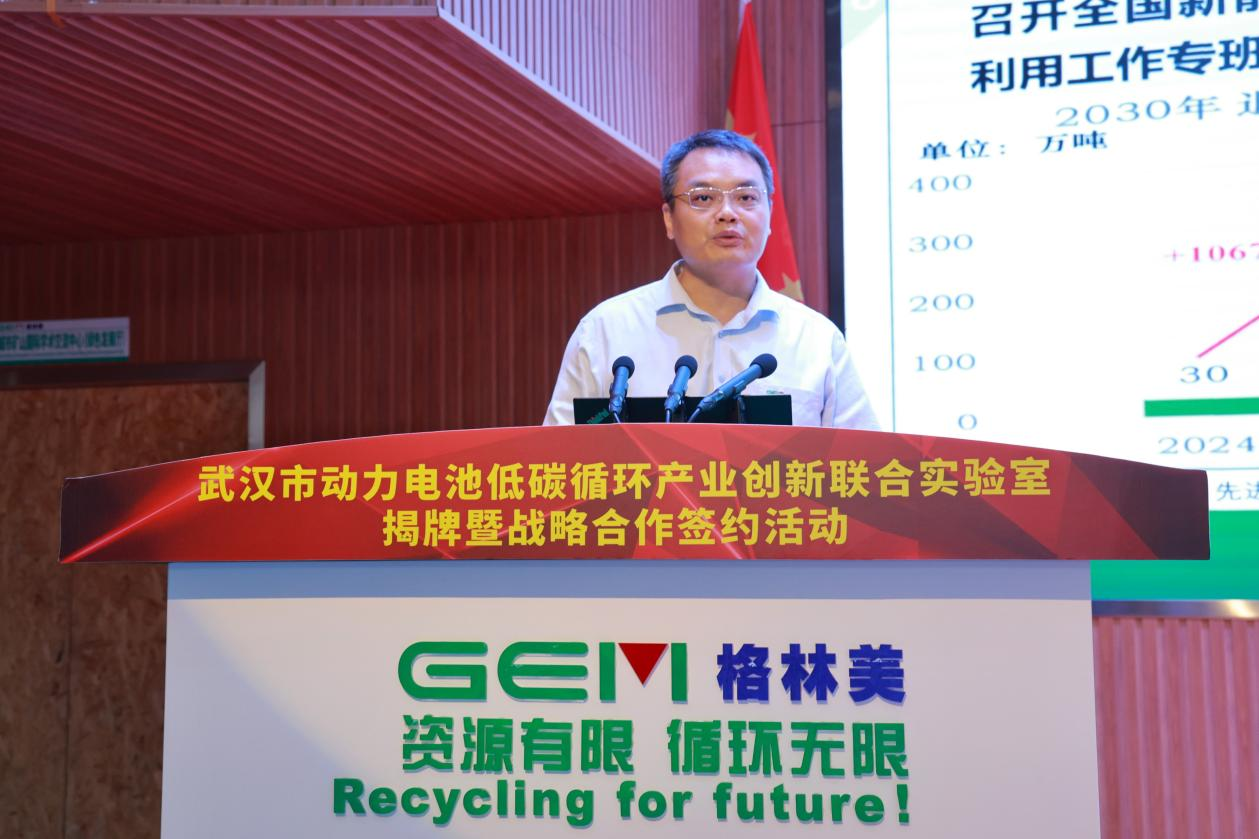 国家能源金属与新能源重点实验室学术委员会主任、格林美集团董事长、动力循环实验室首席科学家许开华教授在致辞中表示,动力循环实验室的挂牌是绿色时代的开端,标志着格林美武汉园区开启绿色新征程。他回顾了公司自2008年以来在电池回收业务领域的深耕历程,并对市委、市政府、长江新区、新洲区及学界、媒体长期以来的支持与信任表示感谢。许开华教授指出,电池回收是国家重要的资源与环境安全战略,也是推动新能源产业可持续发展的关键路径。当前我国钴、镍、锂等关键资源的稀缺,未来必须依靠回收来保障战略资源安全。他预测,到2030年,退役电池中回收的镍、钴、锂将能满足30%的需求,到2040~2050年,循环材料将成为主流供应;预计全球电池回收与循环利用将在2030年形成3000亿元产业规模,到2050年达到万亿级。
