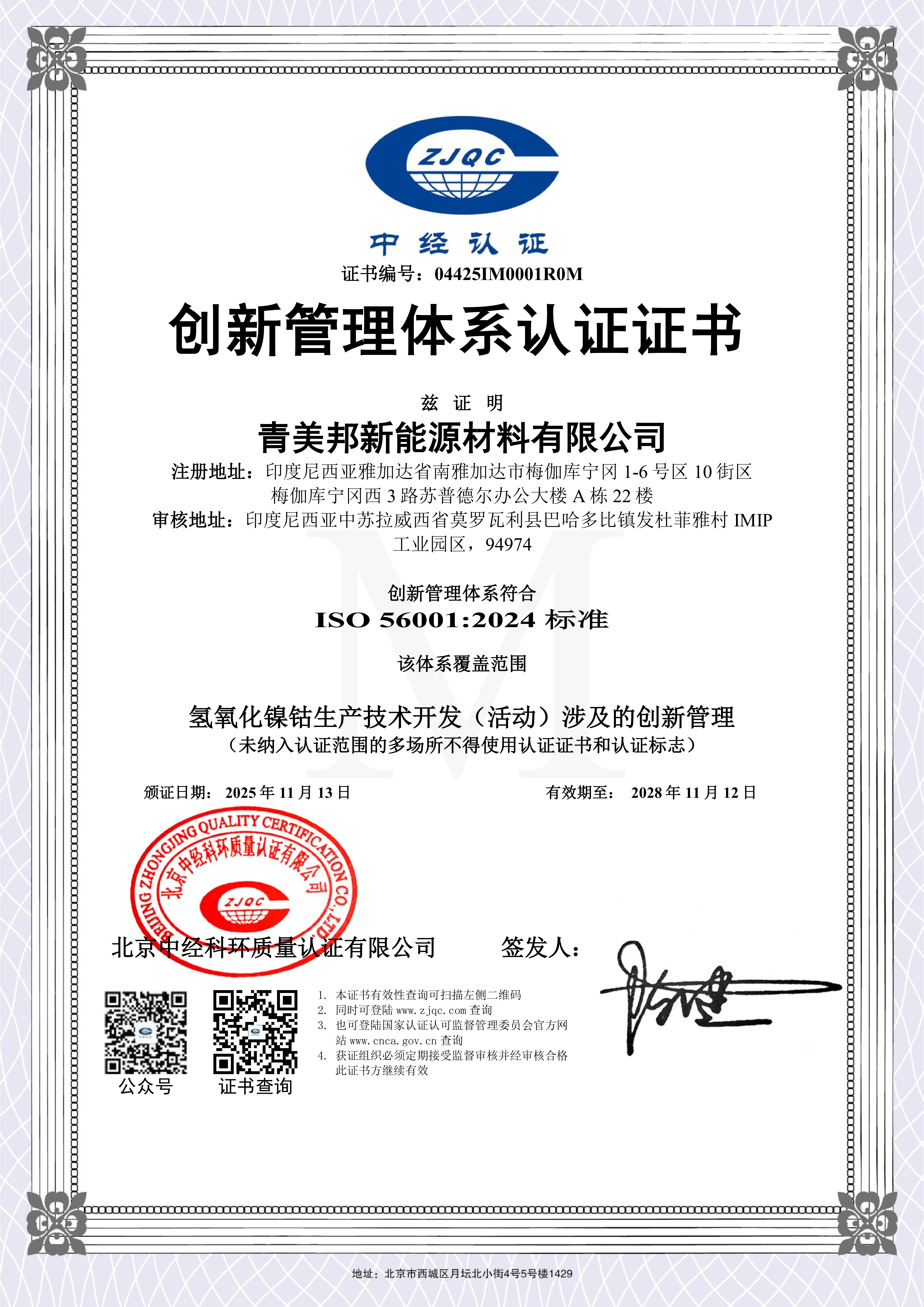 ▲青美邦新能源材料有限公司通过ISO 56001创新管理体系认证
