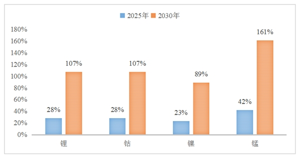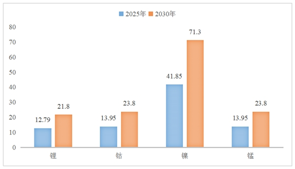 2025/2030年全球新能源汽车锂、钴、镍、锰需求量预测(万吨)