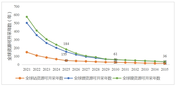 据相关统计数据显示:预计在2035年后,可供开采的锂、钴、镍资源分别只能支撑当年需求量35年、14年和36年。并且随着全球电动化战略目标的实施,或将面临无矿可开采的局面。