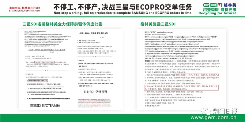 春节期间,格林美荆门园区进出货车不断,生产一片红火,整个园区一派繁忙景象,忙碌的工人们全身心投入到工作中,为第一季度业绩冲刺。格林美董事长许开华教授告诉记者:“1月29日,三星SDI社长亲自发出‘开足全部马力生产的邀请函’的紧急邮件,请求我们春节加班开足马力生产其产品。市场就是命令,我立即回复三星响应:格林美荆门园区不停工不停产,开足全部产能,确保三星订单如期交货,唱响2022年格林美与三星合作开门红之歌。现在我们兑现了承诺,完成三星的紧急订单,再一次获得国际信誉。初一到初六,荆门园区平均每天在岗人数超过3000名,生产三元前驱体超过2800吨,实现产值3个多亿,日均产值超过5000万,仅大年初一当天就生产了近500吨前驱体,产值近6000万。”记者从格林美的公告获悉:2021-2026年,格林美将供应三星供应链超80万吨高镍三元前驱体材料的超级订单,价值近1000亿人民币。
