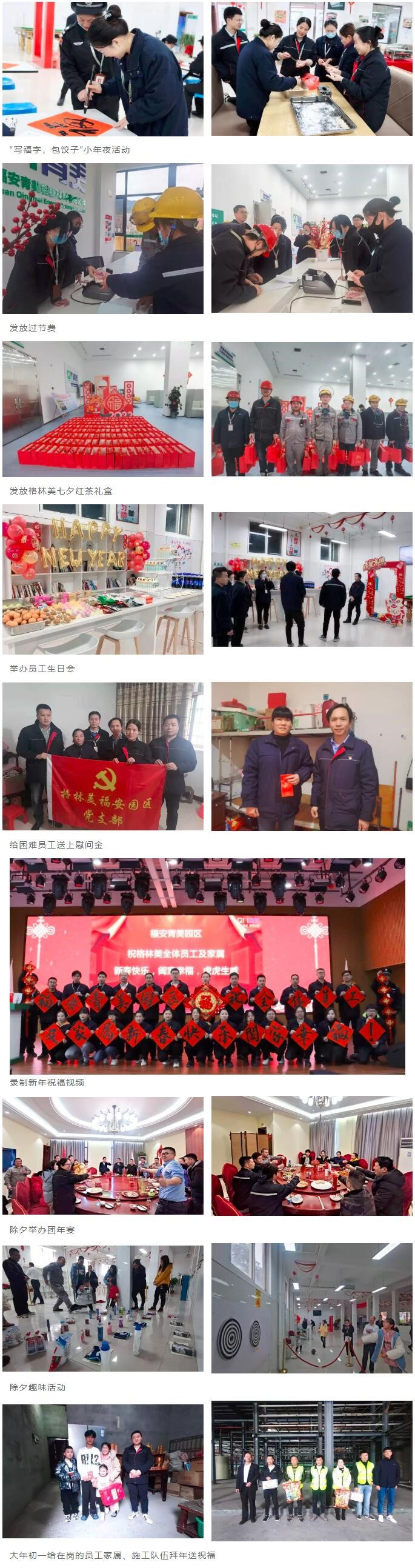 2022年春节前夕,为了响应政府“不停工、不停产,就地过年”的号召,福安青美能源材料有限公司开始积极准备过年期间生活物资的保障工作,积极营造过年良好氛围。从农历小年开始,公司就开始准备春节系列活动,开展“写福字,包饺子”、发放过节费及格林美七夕红茶礼盒、组织员工生日会、给困难员工送上慰问金,除夕当天举行团年宴,开展趣味活动,大年初一给在岗的员工家属拜年送祝福,看望坚守一线的员工。领导干部带头与员工一起在公司过年,让就地过年的员工感受到在“家”的温暖。