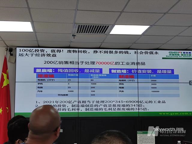 许开华展示的PPT显示,制造端是“价值回收,是增量”,报废端是“残值回收,是减量”。PPT中举例的电视机、手机、电脑、汽车四种产品,它们在制造端的价值平均是在报废端的345倍。也就是说,报废端要产生200亿的销售额,可能要处理7万亿的工业消费品。