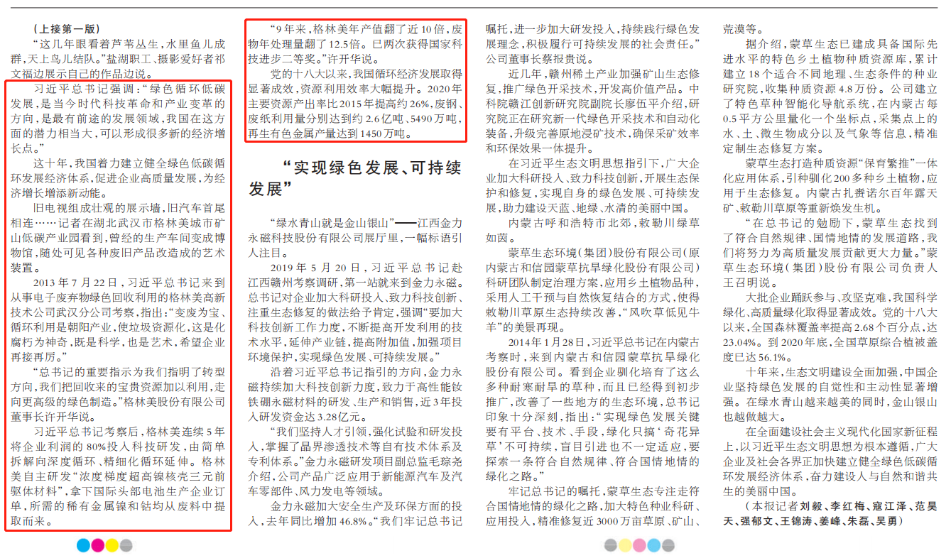 2022年8月22日,《人民日报》头版头条刊发报道《改善生态环境就是发展生产力(这十年,总书记这样勉励企业高质量发展)》,肯定了企业在贯彻新发展理念,实现绿色发展、可持续发展方面作出的重要贡献。其中,格林美作为中国生态环境保护事业和中国绿色低碳循环经济高质量发展的典型代表,再获《人民日报》点赞,这是今年以来《人民日报》第二次在头版头条专题报道中点赞格林美。文中提到(以下内容摘自《人民日报》):