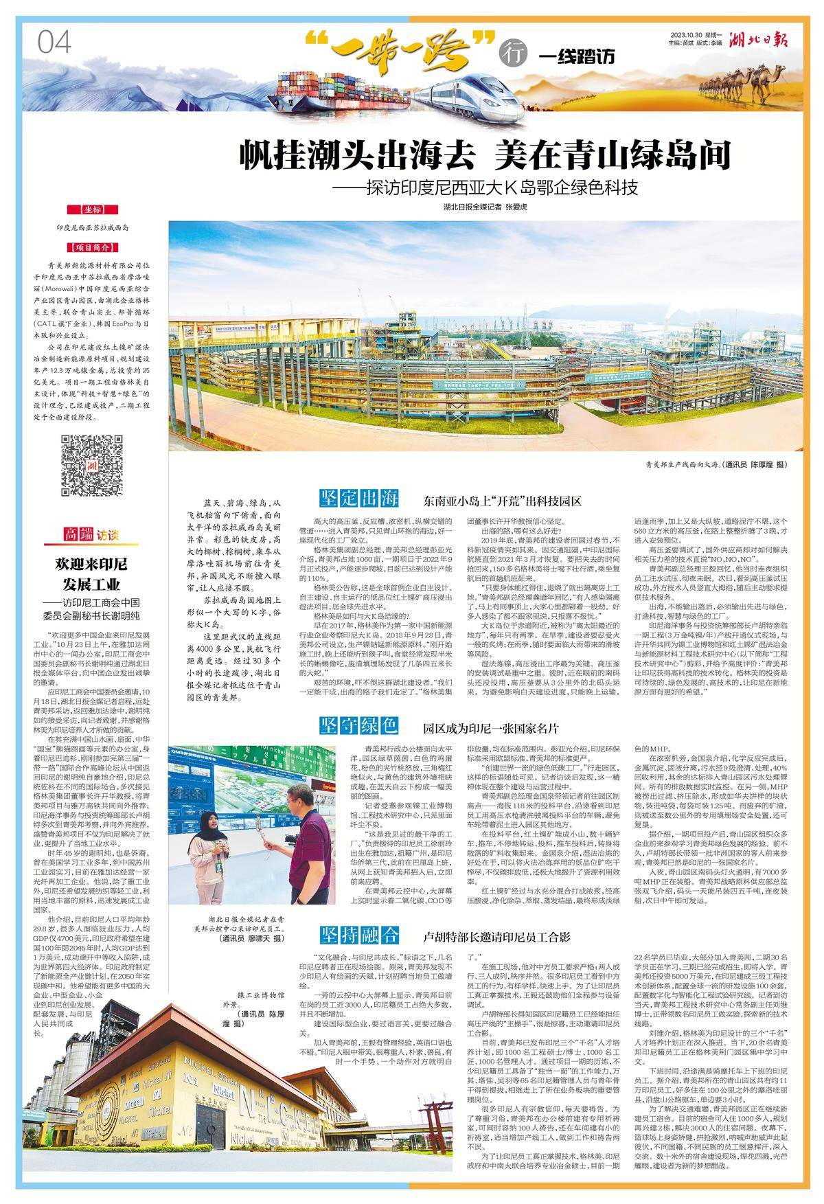 在其充满中国山水画、扇面、中华“国宝”熊猫图画等元素的办公室,身着印尼巴迪衫、刚刚参加完第三届“一带一路”国际合作高峰论坛从中国返回印尼的谢明纯自豪地介绍,印尼总统佐科在不同的国际场合,多次接见格林美集团董事长许开华教授,将青美邦项目与雅万高铁共同向外推荐;印尼海洋事务与投资统筹部部长卢胡特多次到青美邦考察,并向外宾推荐,盛赞青美邦项目不仅为印尼解决了就业,更提升了当地工业水平。