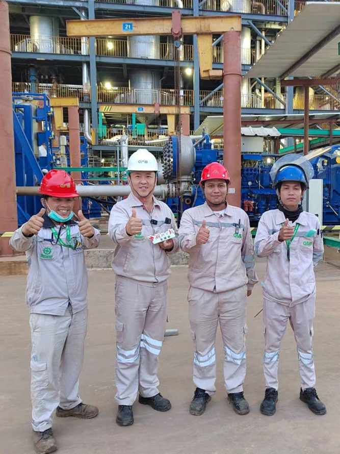 在高压浸出产线,得到青美邦副总经理王毅(左二)指导后,印尼员工点赞。(湖北日报全媒记者 张爱虎 摄)