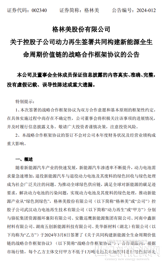 近日,格林美发布《关于控股子公司动力再生签署共同构建新能源全生命周期价值链的战略合作框架协议的公告》。