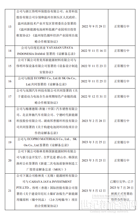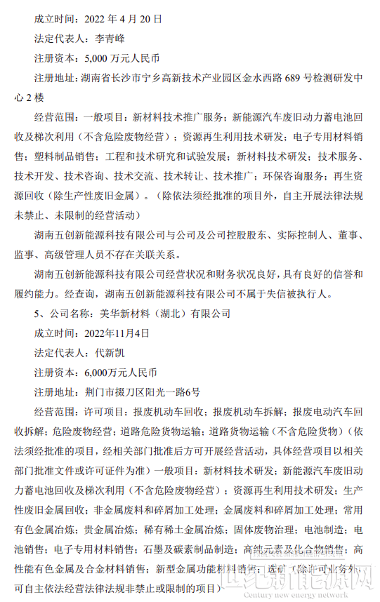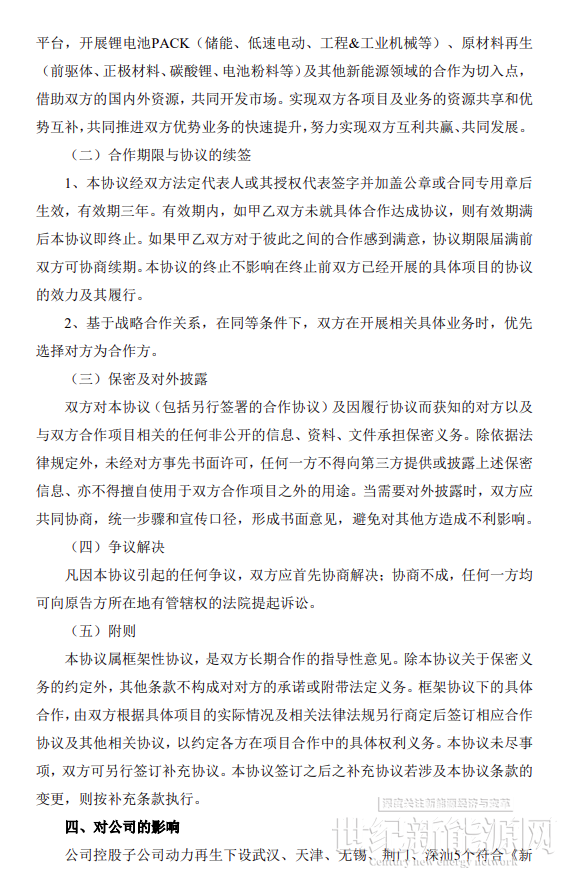 合作期限内,根据市场行情,每个乙方主体交付甲方不低于1万吨电池及电池废料进行绿色循环处理,用于生产制造电池原材料,合作打造“新能源汽车回收—动力电池回收—镍 钴锂电池原料再造—电池材料再造—动力电池再造”全生命周期价值链,推动新能源汽车生产者责任延伸制的落实,共同构建新能源碳足迹体系与ESG绿色价值链,实现经济效益与环境效益的协同发展。