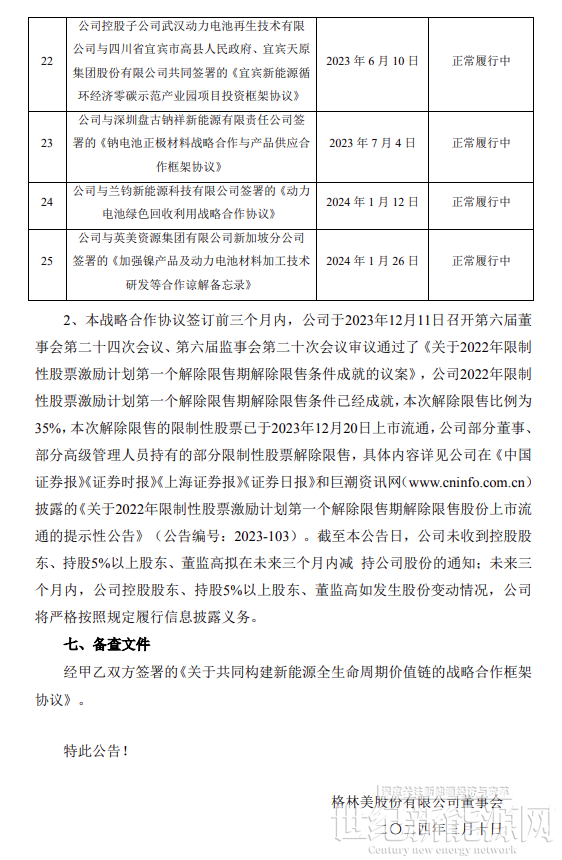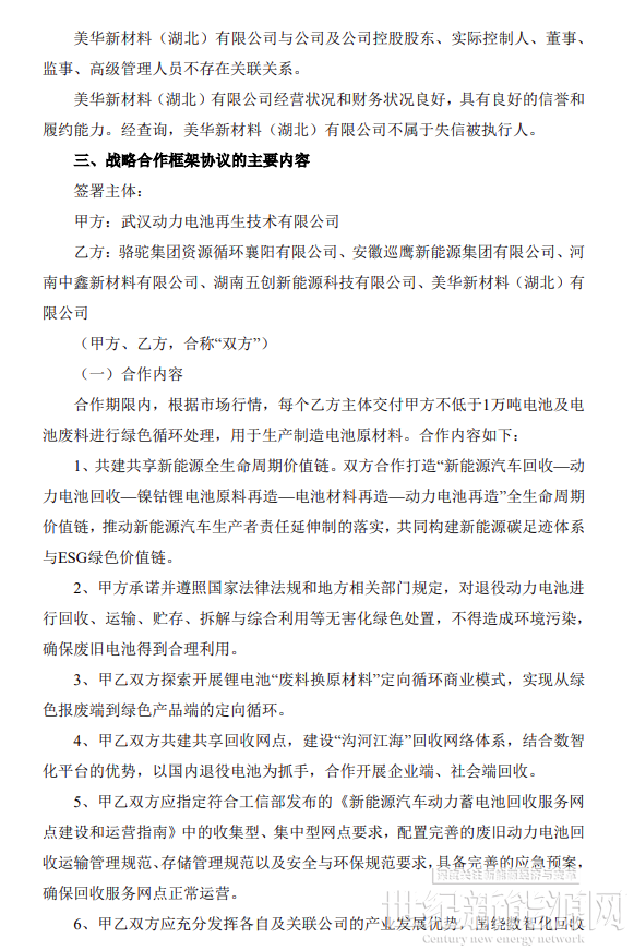 根据公告显示,格林美股份有限公司控股子公司武汉动力电池再生技术有限公司分别与骆驼集团资源循环襄阳有限公司、安徽巡鹰新能源集团有限公司、河南中鑫新材料有限公司、湖南五创新能源科技有限公司、美华新材料(湖北)有限公司(以 下均称为“乙方”)于2024年3月8日签署了《关于共同构建新能源全生命周期价值链的战略合作框架协议》。