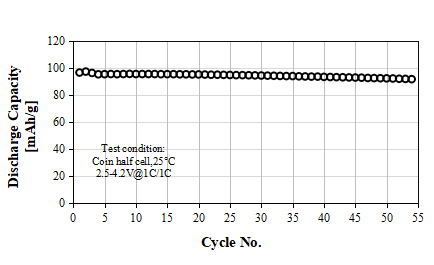 S-2500产品应用:用于方型或软包电池,扣电4.20 V下测试,0.1C放电比容量为96.74 mAh/g,循环性能:1C/1C,50周≥90%,可用于电动自行车或电动工具。