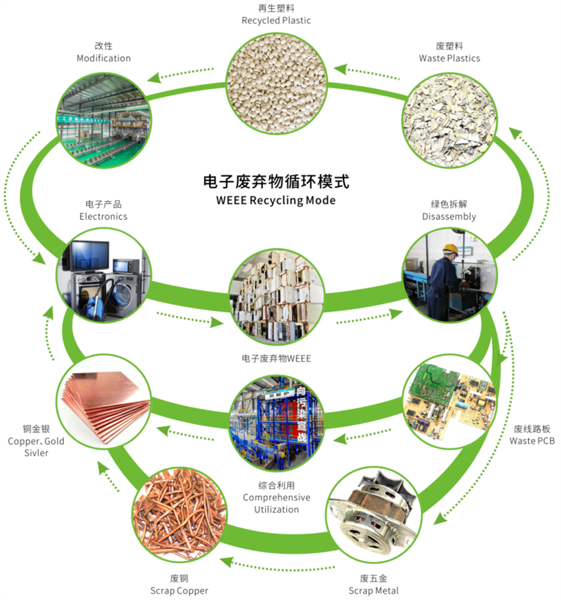 We have established an electronic waste recycling value chain of “electronic waste collection and dismantling - plastic waste regeneration – rare and precious metal regeneration”.