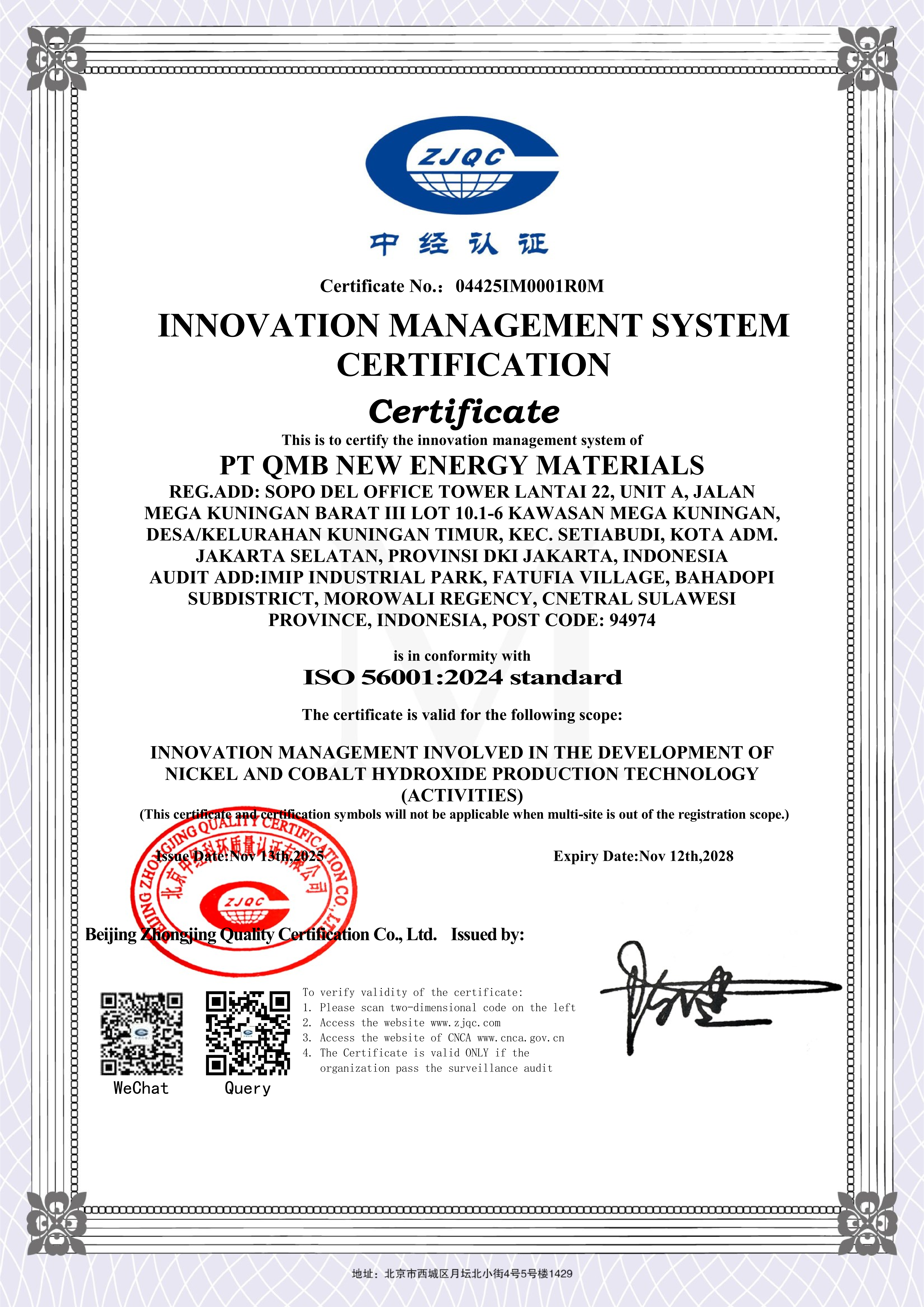 ▲PT QMB NEW ENERGY MATERIALS Obtained Innovation Management System Certification(Based on ISO 56001)