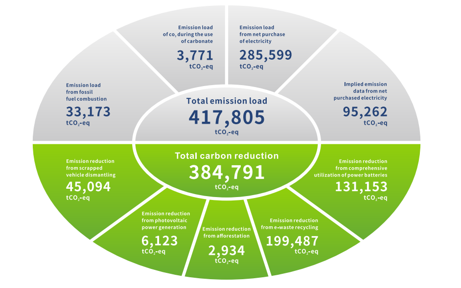 Since its establishment in 2001, GEM has been taking the carbon emission peak and carbon neutrality as its service mission, creating a low-carbon circular industrial chain based on carbon emission reduction, and actively responding to the national call for the "carbon emission peak" with practical actions. In recent years, GEM has promoted the implementation of the "dual carbon" strategy through resource recycling, the use of clean energy, and the promotion of cleaner production. In 2021, the annual carbon emissions of GEM's core business were 417,805 tons, with an emission intensity of 19.26tCO2-eq/RMB millions of output value, a decrease of 16.38% compared to 2020. At the same time, GEM accelerated the development of the low-carbon cycle in major industrial chains, and actively practiced carbon emission reduction with practical actions. The annual carbon emission reduction of core business was 384,791 tons, 57.71% higher than that of 2020; the net CO2 emission was 33,000 tons, down 60% year-on-year, showing a carbon neutrality trend.